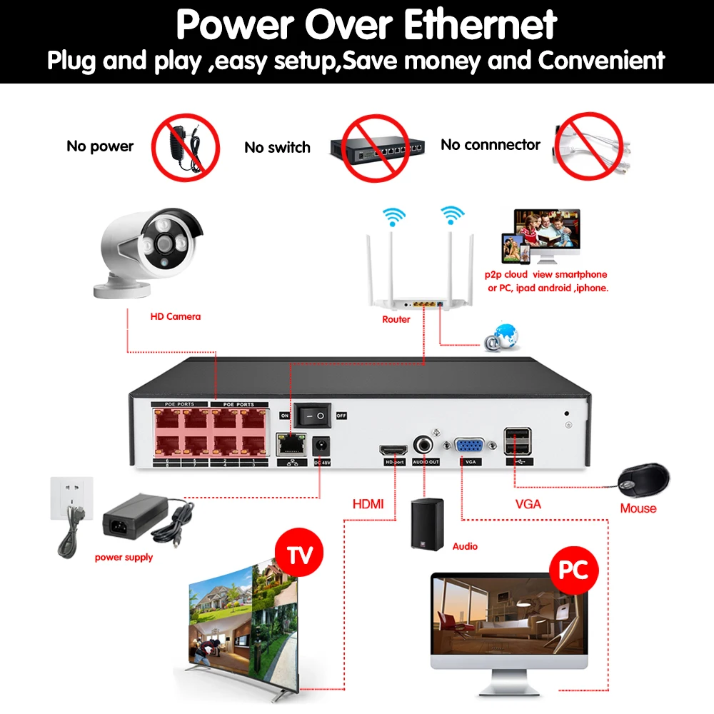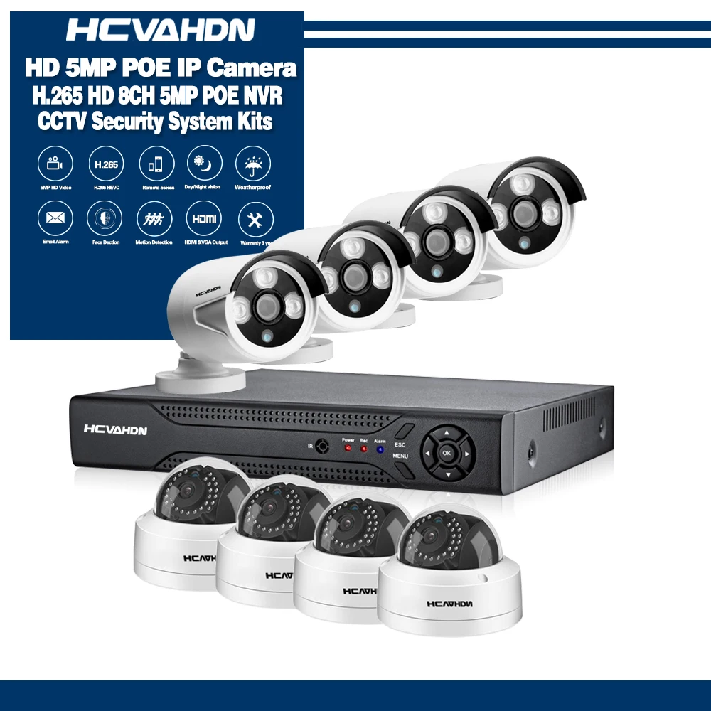 HCVAHDN 8CH 5MP POE NVR Xmeye CCTV System 4.0MP Indoor Outdoor PoE IP Camera IR Night Vision Video