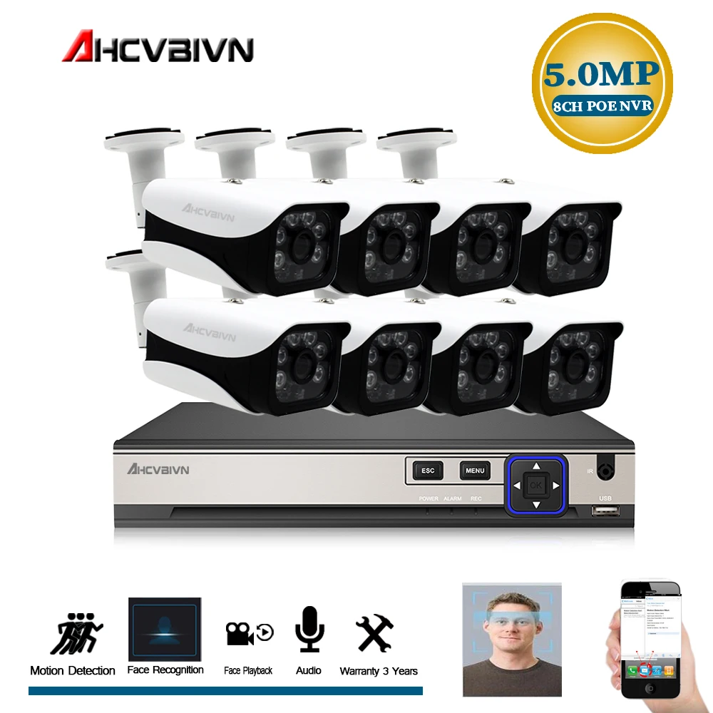 AHCVBIVN 8CH CCTV Surveillance Kit 5MP Security Camera System 4CH 8CH POE NVR With 5.0MP POE IP Cam