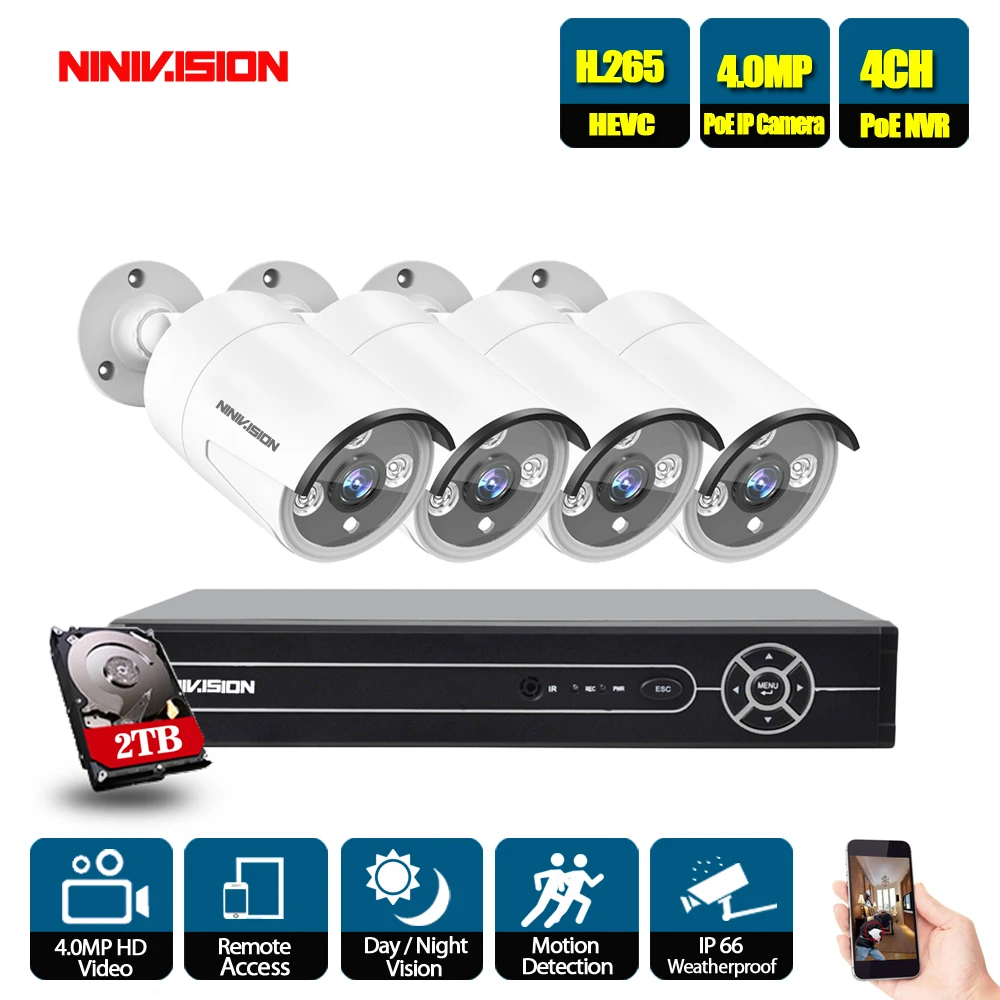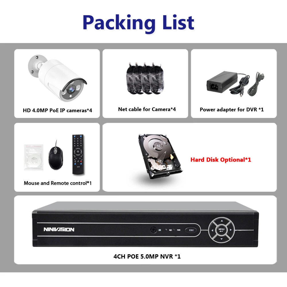 HOT Sale NINIVISION 4CH CCTV Surveillance Kit HD 5.0MP 2592x1944P Outdoor Security Camera System with 4 x 4M