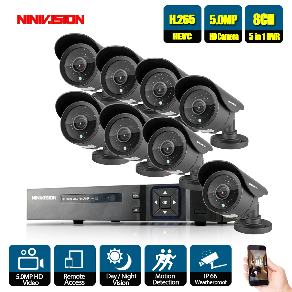 Hot Sale NINIVISION 5MP Home Security DVR NVR 8pcs 5.0MP CCTV Camera System indoor Outdoor IR Night Vision S