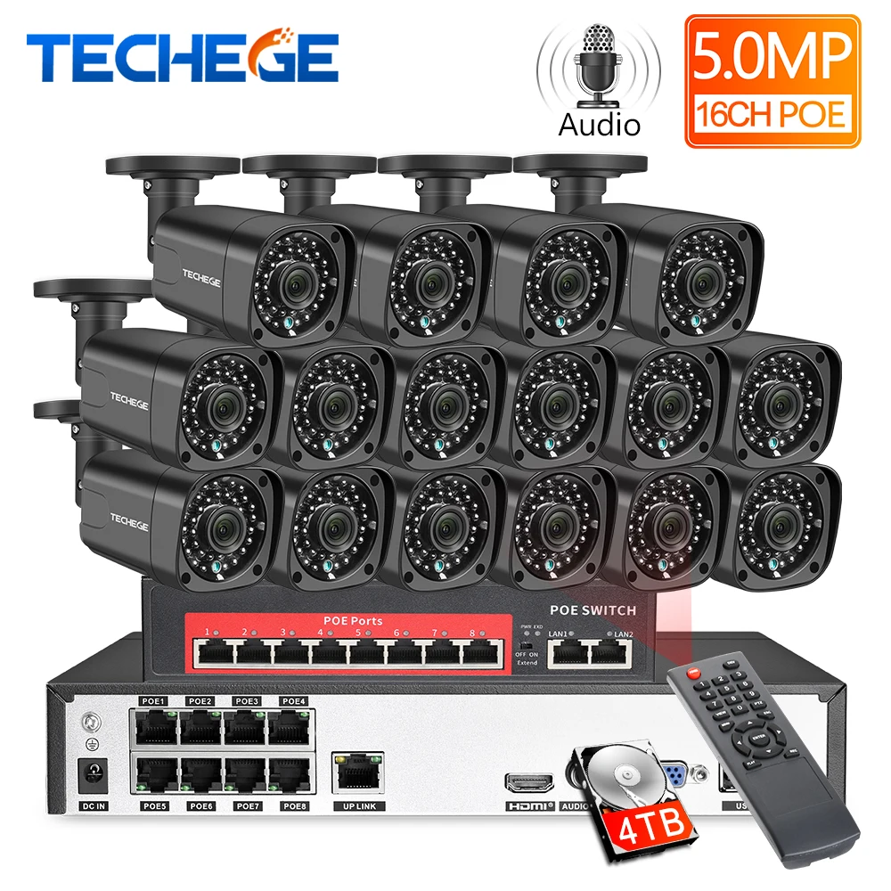 Techege 16CH 5MP Audio Record POE Camera Security CCTV System 2592x1944 POE NVR Outdoor Waterproof