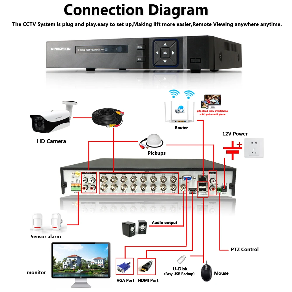 NINIVISION H.265 16CH 2MP 5MP AHD NVR CCTV Security System 16PCS IR Outdoor 5.0MP Security Camera P