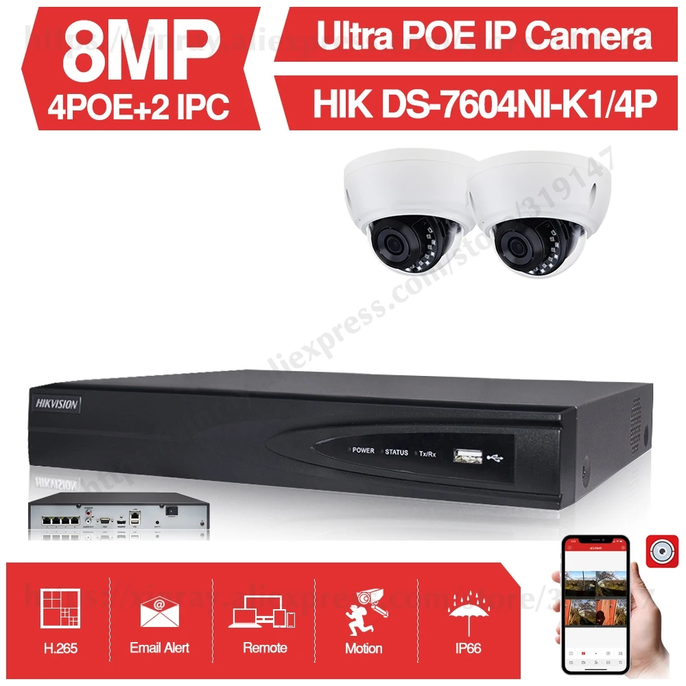 Hot Sale 4CH CCTV System 2PCS Ultra 8MP Dome Security POE Camera IK10 with Hikvision 4POE NVR DS-7604NI-K1/4
